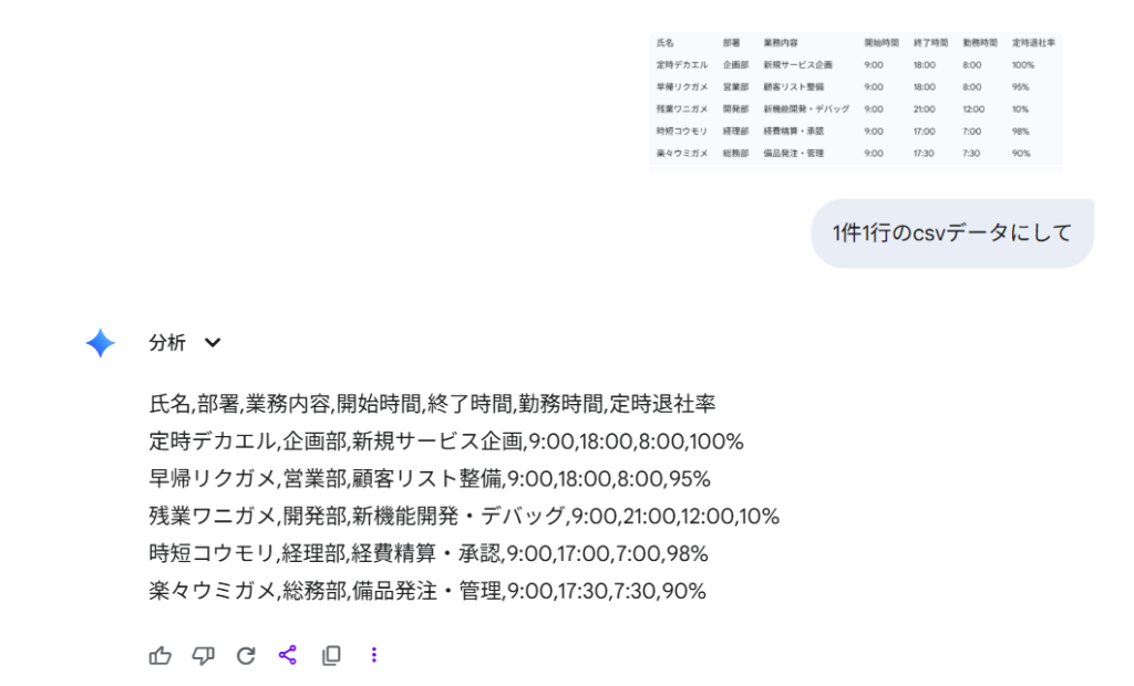 (例)「1件1行のCSV形式にして」