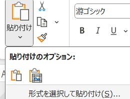 貼り付けボタンの下部分をクリックして「形式を選択して貼り付け」をクリックします