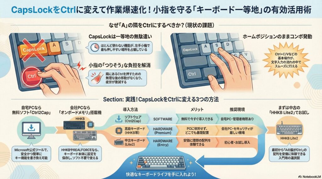 今回は、そんなあなたの指と時間を救う、キーボードの一等地「CapsLock」を「Ctrl」に変える方法について解説します。これを知ってしまったら、もうキーボード沼の入り口に立っているも同然ですよ!