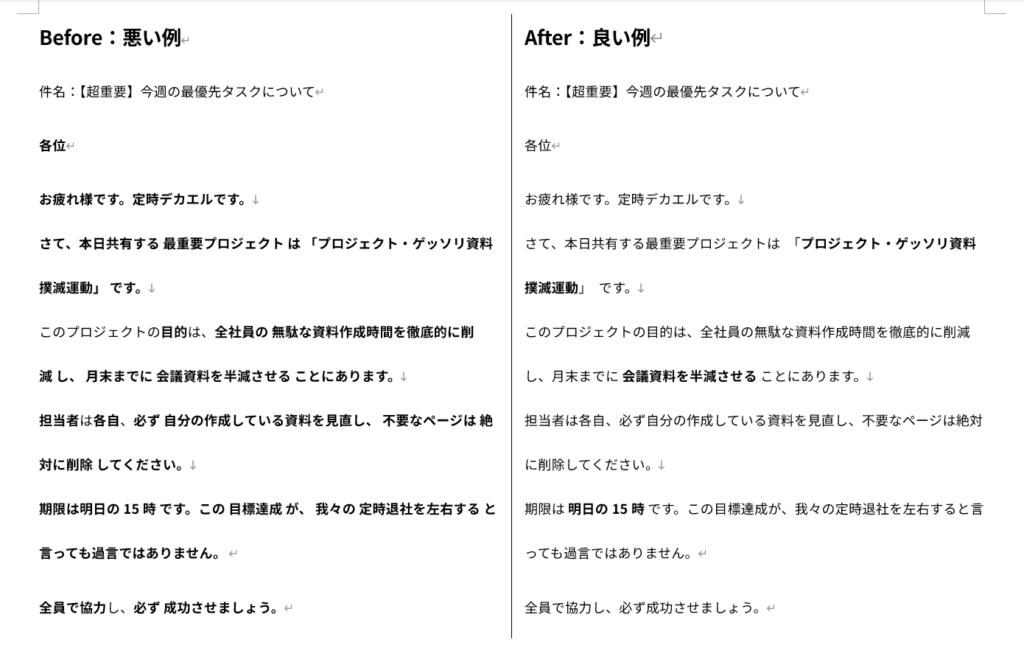 それは、使いすぎないことです。「あれも大事」「これも重要」と、あちこち太字にしてしまうと、全体的に黒々として重たい印象になり、かえってどこが重要なのか分からなくなってしまいます。太字はあくまで「アクセント」。ここぞというポイントで使うからこそ、その部分が際立ちます。資料全体を見渡して、本当に強調したい部分だけに絞って使うように心がけてみてくださいね。