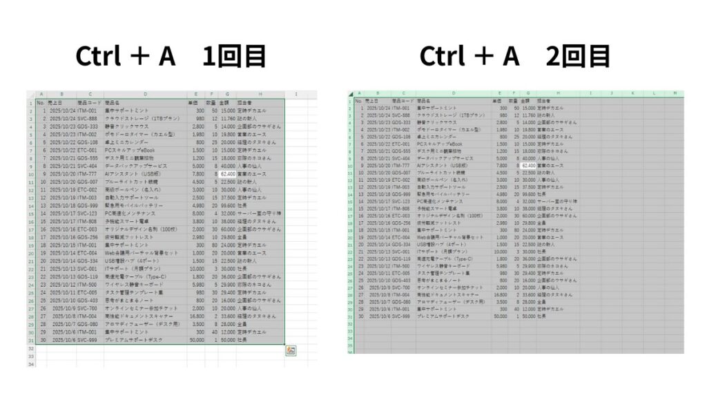 • 1回目:データが入力されている表(アクティブセル領域)の全体を選択します。
