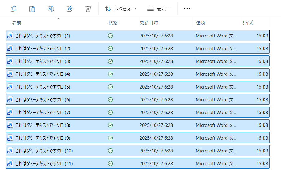 私がCtrl + Aを一番よく使うのは、この「ファイルの全選択」かもしれません。 フォルダ(エクスプローラー)を開いている状態でCtrl + Aを押すと、そのフォルダ内にあるすべてのファイルやフォルダを一瞬で選択できます。 例えば、こんな時に大活躍します。