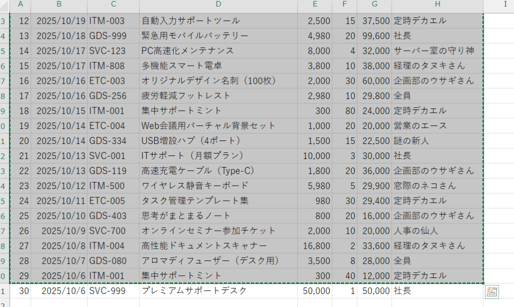 なぜかというとExcelのマウスドラッグでの範囲選択は1行でもずれると大きなミスにつながる場合があります。